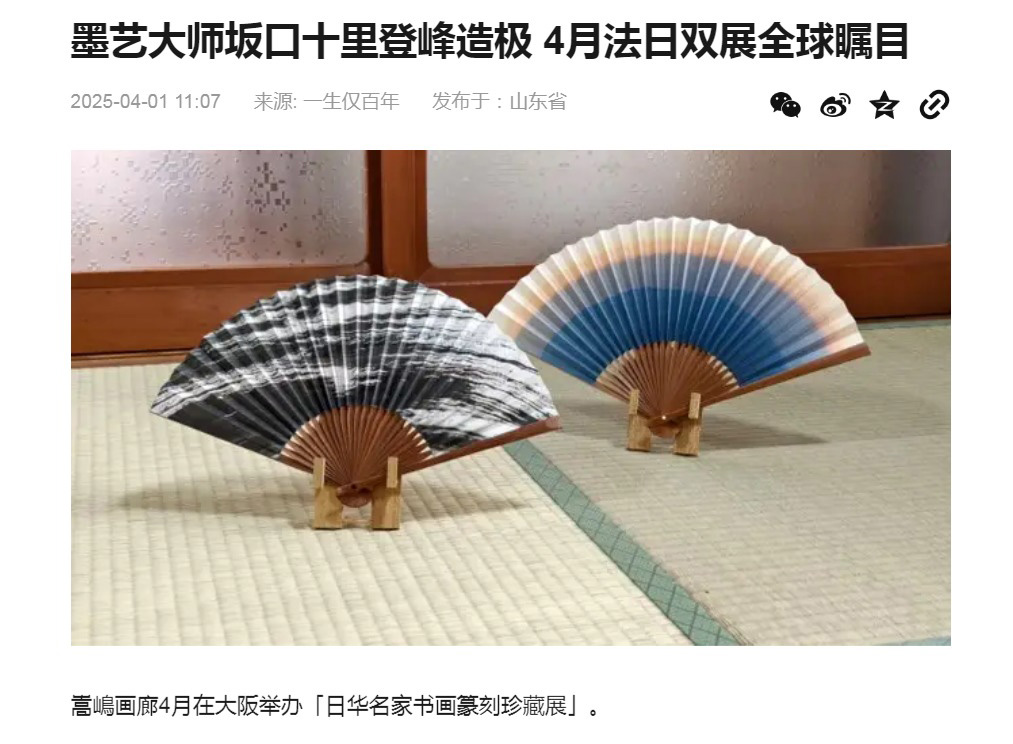 日本書畫藝術家坂口十里,水墨創作系列《不存在的幻想空間》同步展於日本大阪「日華名家書畫篆刻珍藏展」、法國巴黎羅浮宮卡魯塞爾廳「Art Shopping 2025當代國際藝術博覽會」,系列原作與複製的京都折扇由私人收藏家以900萬日圓購入典藏。