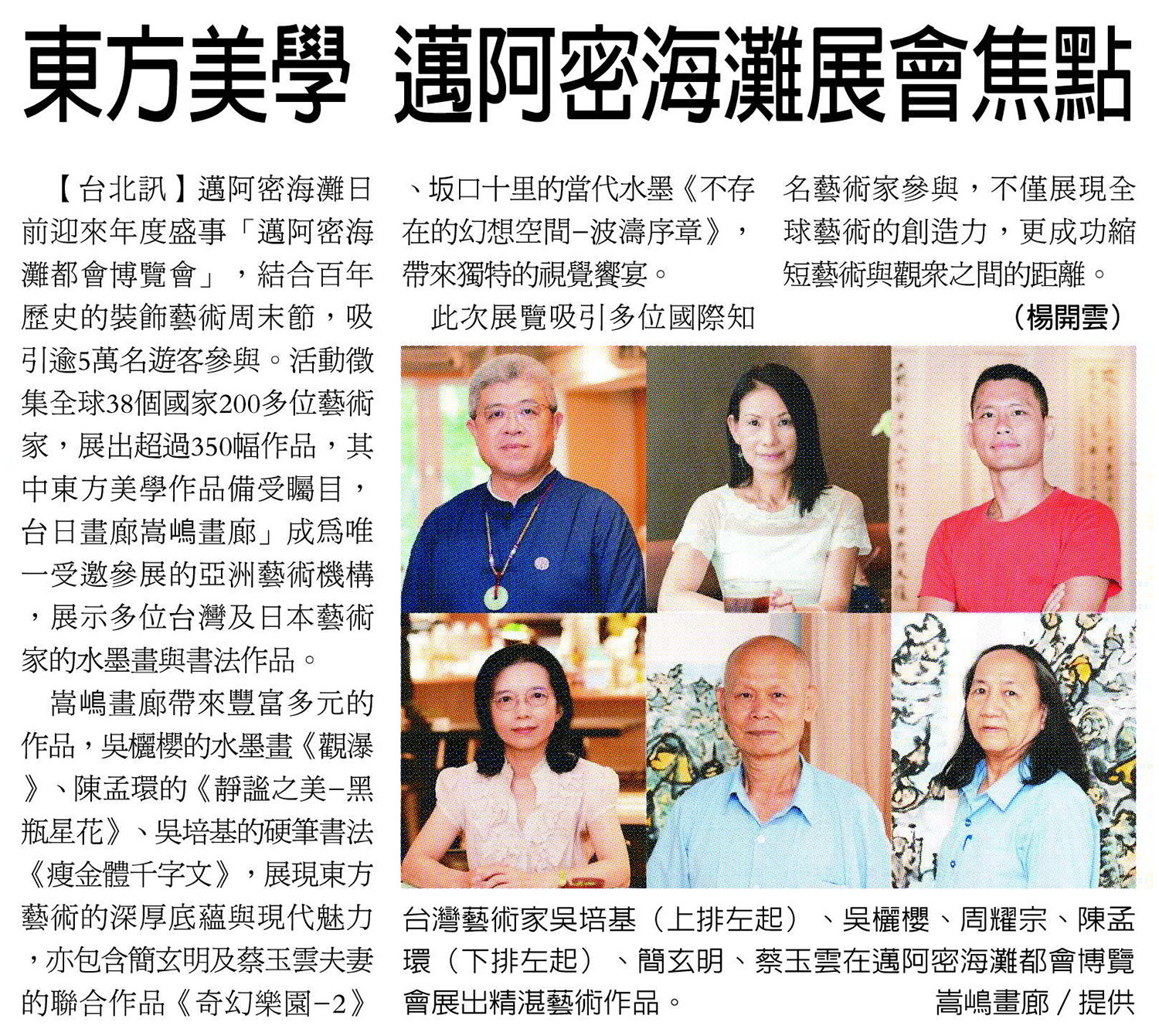 台日畫廊業者「嵩嶋畫廊」為此次展覽中唯一以畫廊名義受邀參加的亞洲藝術機構。嵩嶋邀請台灣及日本多位藝術家吳欐櫻、陳孟環、吳培基、簡玄明、蔡玉雲、周耀宗、坂口十里聯袂參展,於活動中展出多樣化的水墨創作與書法藝術,包括氣韻生動的水墨畫、寓意深遠的書法對聯,以及精湛有力的硬筆書法。此次展覽彰顯台日藝術家的創作實力,透過東方美學風格,促進亞洲與國際藝術界的文化交流,觀眾帶來獨特的視覺饗宴同時將水墨書法藝術推上世界級藝術舞台。